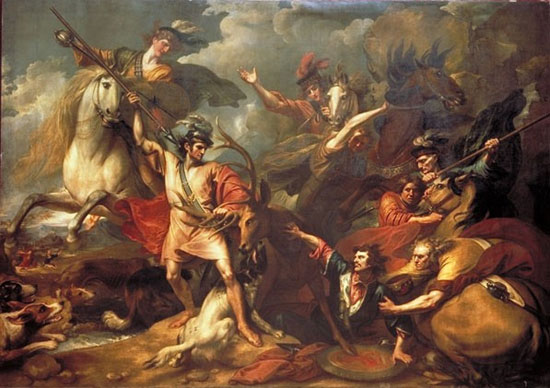 Legend has it that King Alexander 3rd of Scotland was out hunting with Colin Fitzgerald, founder of the Clan. The King was attacked by a stag and Colin saved his life by spearing the beast through the forehead. To show his gratitude Alexander gave Fitzgerald the lands of Kintail and the MacKenzie armorial bearings show the stag bleeding from the forehead. The above painting by Benjamin West was commissioned in 1785 by Francis Humberston Mackenzie later Viscount Seaforth & Baron Mackenzie of Kintall. The painting hung in Brahan Castle until it was demolished and is now in the care of the National Gallery of Scotland. This fantastic painting is 12 feet by 17 feet accross.